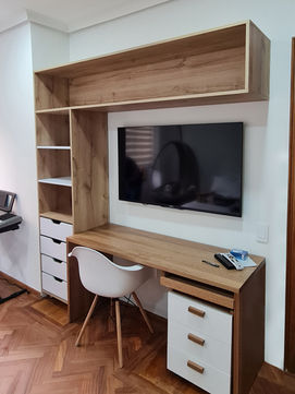 Cocina lineal hasta 3m: Muebles superiores e inferiores en melamina RH, con campana, cubierta y lavaplatos.